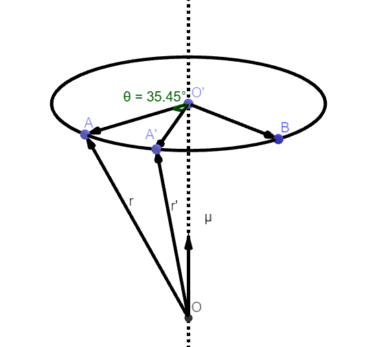 设刚体以\(\boldsymbol{\omega}=\omega_x\textbf{i}+\omega_y\textbf{j}+\omega_z\textbf{k}\)相对于\(\textbf{R}\)系旋转,初始时刻位置向量为\(\textbf{OA}=\textbf{r}\),经过时间\(t\)后位置向量处于\(\mathop{\textbf{OA}'}=\mathop{\textbf{r}'}\)。根据欧拉定理,仅考虑刚体在0时刻和\(t\)时刻的角位置时,刚体从\(\mathop{\textbf{A}}\)位置转动到\(\mathop{\textbf{A}'}\)可等效成绕瞬轴\(\mu\)(单位向量)转过\(\theta\)角一次完成。这样,单位向量做圆锥运动,\(\mathop{\textbf{A}}\)和\(\mathop{\textbf{A}'}\)位于同一个圆上,\(\mathop{\textbf{r}}\)和\(\mathop{\textbf{r}'}\)位于同一圆锥面上。