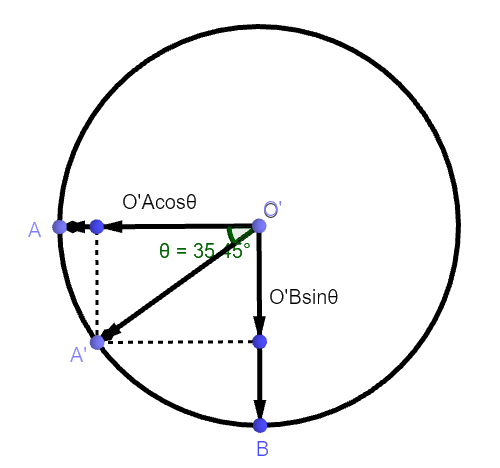 下面分析\(\mathop{\textbf{r}}\)和\(\mathop{\textbf{r}'}\)的关系。在圆上取一点\(B\),使\(\angle A\mathop{O'}B=90^\circ\),由图得: