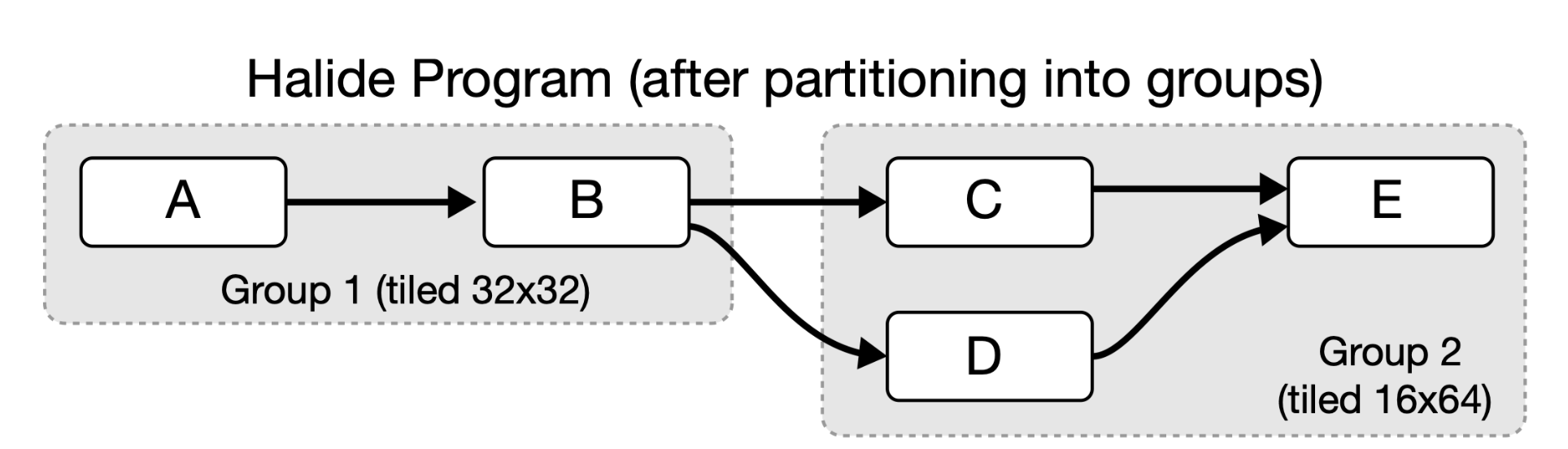 由于在两个不同的loop nests中取计算同一个function将会造成重复执行, 因此grouping只会尝试合并唯一消耗g1的输出的那个组. 比如上图所示, 函数对A-B,C-E,D-E都是candidate. 但是B-C和B-D不是,因为B的输出同时被C和D所消耗了.