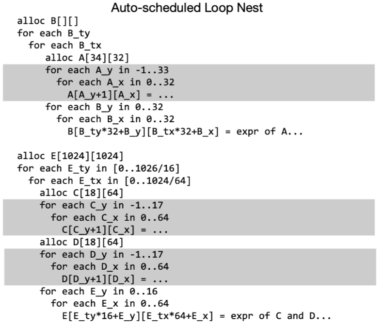 在上图中展示了一种可能的schedule方案, 注意到所有的function都会在这个group的输出function中计算(灰色区域), 此时同一个group中的producer-consumer关系通过一个比较小的local buffer(A,C,D)进行管理, 实际运行时他们很容易被保存在cache上. 然后每个group之间则通过main memory进行通信(Buffer B).