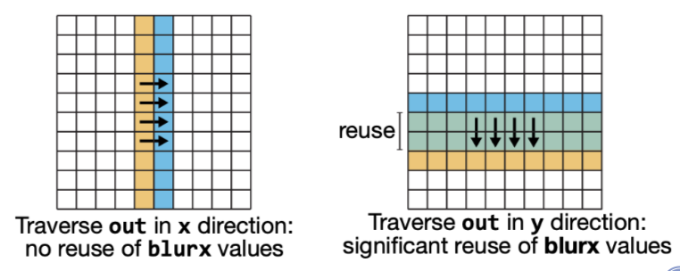 为了辅助决策, 对于每个函数需要计算它在哪一个loop order上进行迭代可以产生更高的输入数据reuse. 如下图所示, 考虑以行先的顺序计算输出out的元素, 每个元素只需要从相同的blurx的列进行取数,因此每个our所需要的元素都是一组新的input集合, 这样就没有重叠的数据reuse了. 相比之下,如果以列在先的顺序计算out, 那么每次都可以两到三个数据reuse.