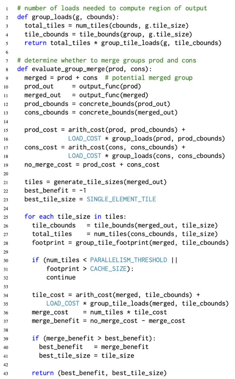 对于每个候选的tilie size,需要估计并比较执行grouping的成本,对于不合并的cost由生产者和消费者组的算术成本(Arith_cost,加上每个组的内存载入cost(Group_loads)组成。 总的load次数(整个程序的执行)由其输出函数(11-12行)的具体边界和group当前设置的tile size给出。 其中LOAD_COST则是从mian memory中加载数据cost的系数.