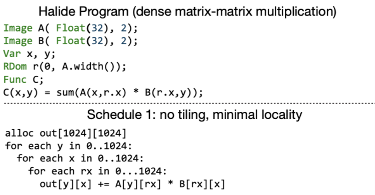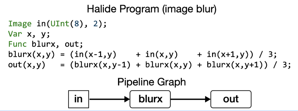 如下的halide代码就对应了一个简单的计算图, 包含两个函数(Blurx和Out),每个函数在由变量x和y参数化的2维上进行计算. DAG中的边对应于函数之间的数据依赖性, 即有一个边从Blurx到Out,因为每个out的值是Blurx产生的三个值的总和.