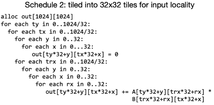 即使在这个简单的例子中,全局循环reorder也对程序的性能产生了大量影响. 真实世界图像处理管道可能包含数百个function,为了有效地调度它们,我们要调整多维tiling的大小/生产者和消费者在循环中的位置, 从而在局部性/并行性/冗余计算之间的trade-off.