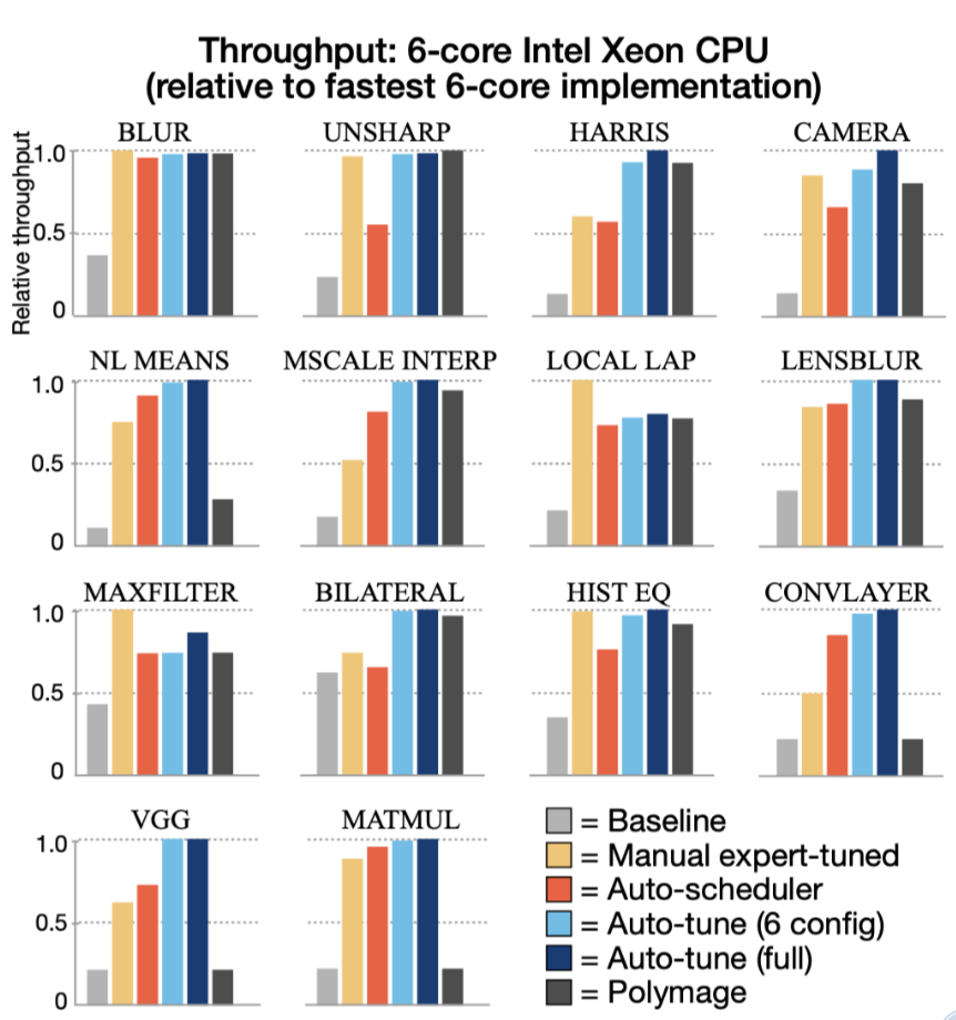 在本文中,提供了一种用于自动生成halide程序的高性能调度策略的算法. 此解决方案扩展了已经存在于halide编译器中的边界分析,来自动实施典型的halide的局部性转换和并行执行调度策略. 该算法不需要非常大的自动搜索空间,在几秒钟内就能为广泛的图像处理算法创造性能对标的大型图像处理库的调度结果,同时支持CPU以及GPU.