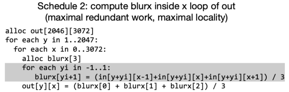 此时换一种调度方式, 将计算blurx放到不同的循环位置, 那么计算完blurx立刻被消耗, 不同的循环位置决定了不同的data reuse distance. 当前这种方式最大化了producer-consumer locality, 但是也带来了recompute的问题, 即多算了3次.