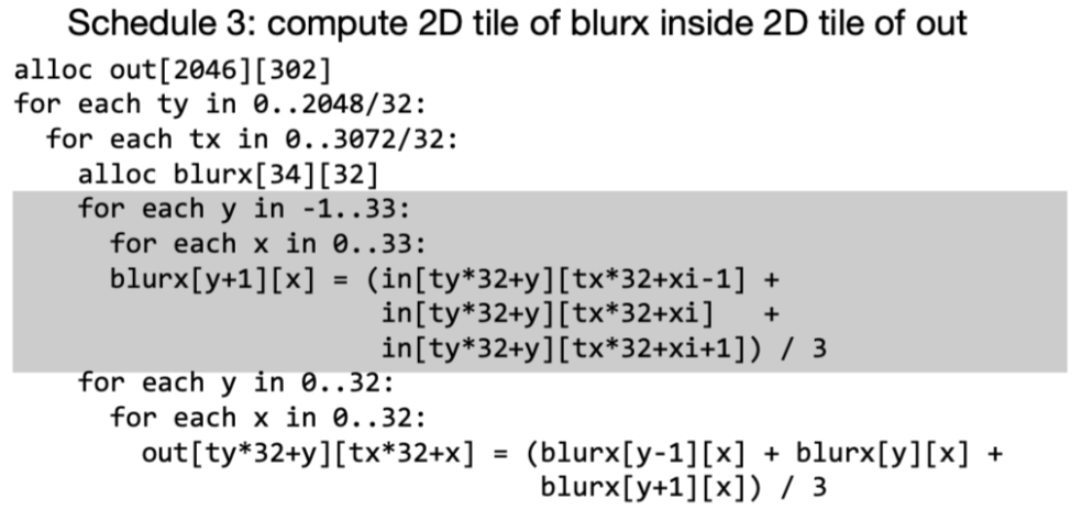 此外将producer函数内联到consumer中可能是有利的(如果是手动编写的Halide schedule是需要显式的使用inline指令).