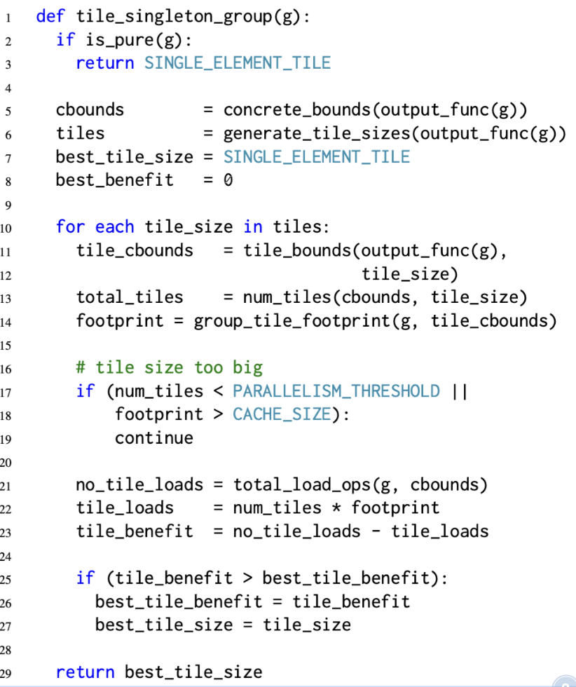 调度器尝试查找通过每个non-pure的函数来改进输入数据访问的循环tiling。(pure-function 即不包含任何halide更新定义或reduce domain的函数,例如不用tiling直接就具备良好的input locality), 然后采用了一个单级存储层级的简单模型进行分析,其执行的伪代码如下: