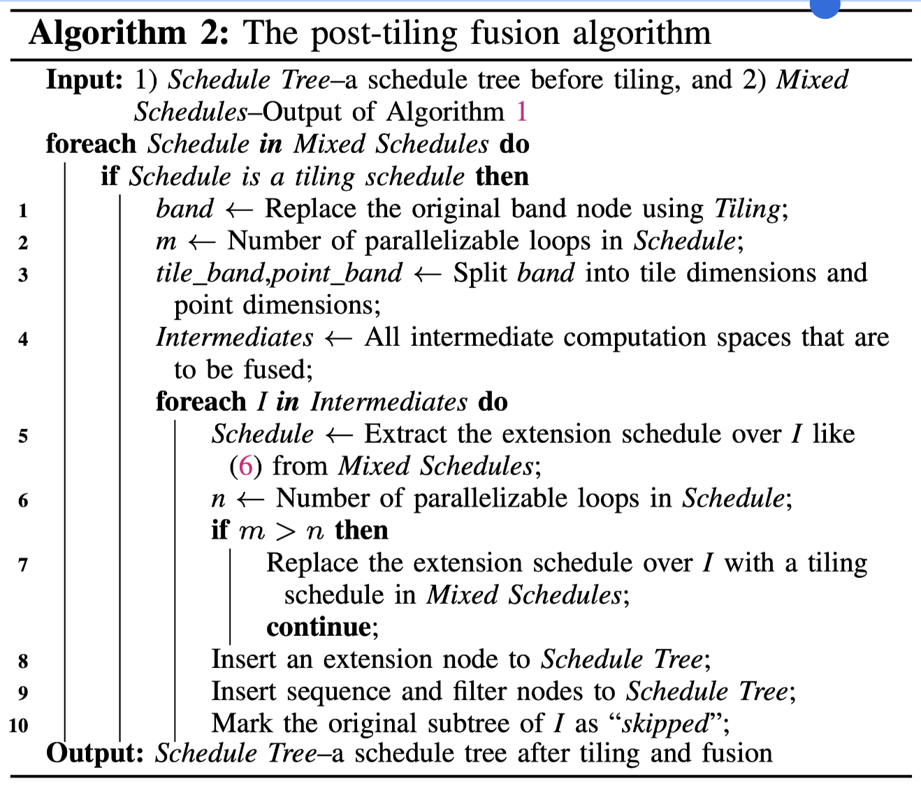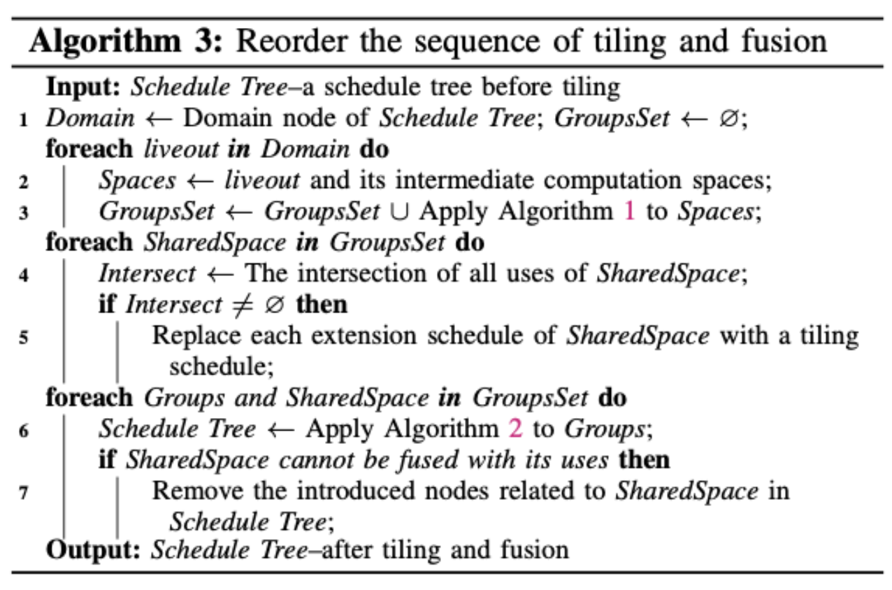 1.每个live-out computation及其intermediate computation spaces都是从输入调度树的迭代域提取并保存在\(Spaces\)中的,然后将算法1应用于它上面(第3行).这样可以防止live-out computation space之间的fusion,因为live-out value不一定需要在spad上分配.\(GroupsSet\)是\(Group\)的集合,即每个\(Spaces\)应用算法1的输出. 2.处理被多个liveout computation space所使用的intermediate computation space \(SharedSpace\).第四行是计算所有的extension schedule对于\(SharedSpace\)的交集,如果交集非空,使用tiling schedule替换extension节点,表示不对它进行fusion. 3.将算法2应用于\(Groups\)(第7行),用于在tiling和fusion后构建调度树.如果\(SharedSpace\)不能与任何一个使用了它的fuse在一起,则算法将删除与调度树中与引入的相关与\(SharedSpace\)的节点,从而防止可能的fusion,避免冗余计算.