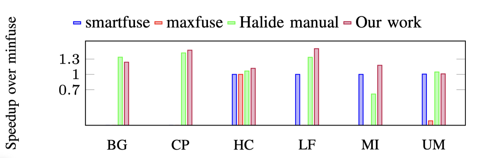 PolyMage和本文的工作也可以自动应用Harris Corner Detection的内连转换83,这是Halide的手动调度所欠缺的.本文方法生成了与PolyMage相同的代码,因此获得了相同的结果,优于Halide的手动调度2倍.