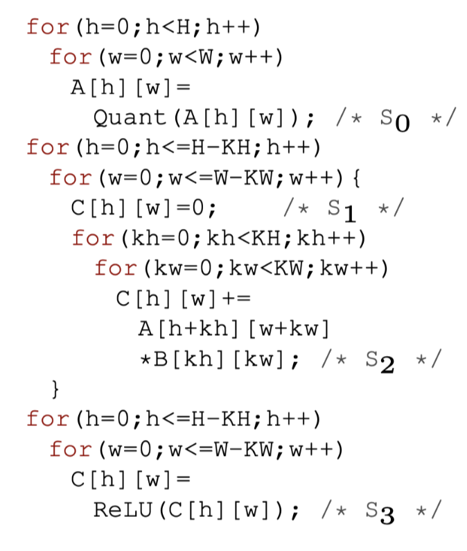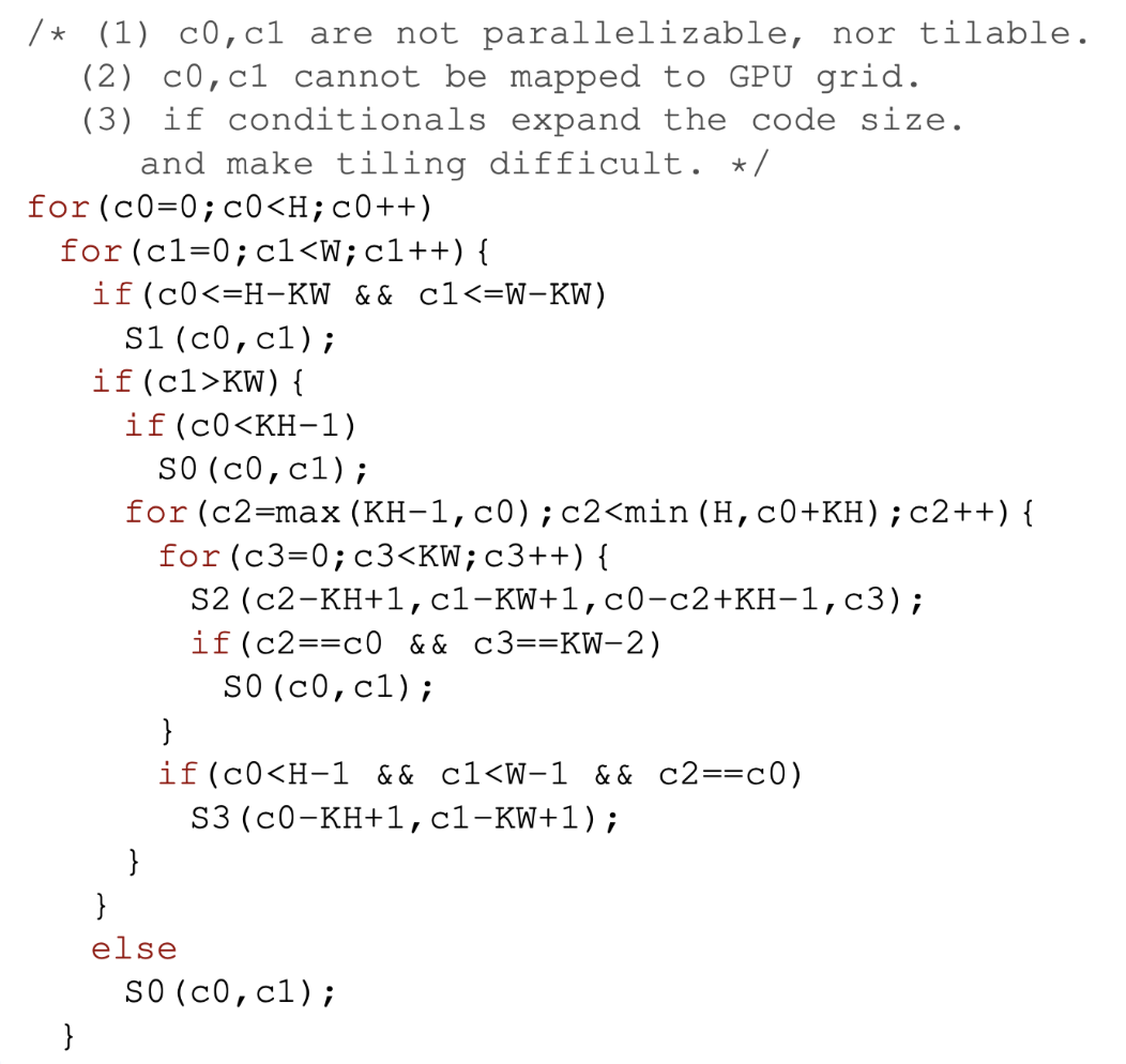 继续考虑图1(a)的例子,他其实是由三个嵌套循环组成的. 假设输入的H=W=6,kernel的大小为KH=KW=3.在\((\{S_0\},\{S_1,S_2,S_3\})\)上的fusion结果如图1(b)所示.这种矩形tiling可以通过实施如下的仿射变换进行transform. \[ \begin{array}{r} \left[\left\{S_{0}(h,w) \rightarrow\left(h / T_{0},w / T_{1},h,w\right)\right\},\left\{S_{1}(h,w) \rightarrow\left(h / T_{2},w / T_{3},h,w\right)\right.\right. \\ S_{2}(h,w,k h,k w) \rightarrow\left(h / T_{2},w / T_{3},h,w,k h,k w\right) \\ \left.\left.S_{3}(h,w) \rightarrow\left(h / T_{2},w / T_{3},h,w\right)\right\}\right] \end{array} \tag{1} \]