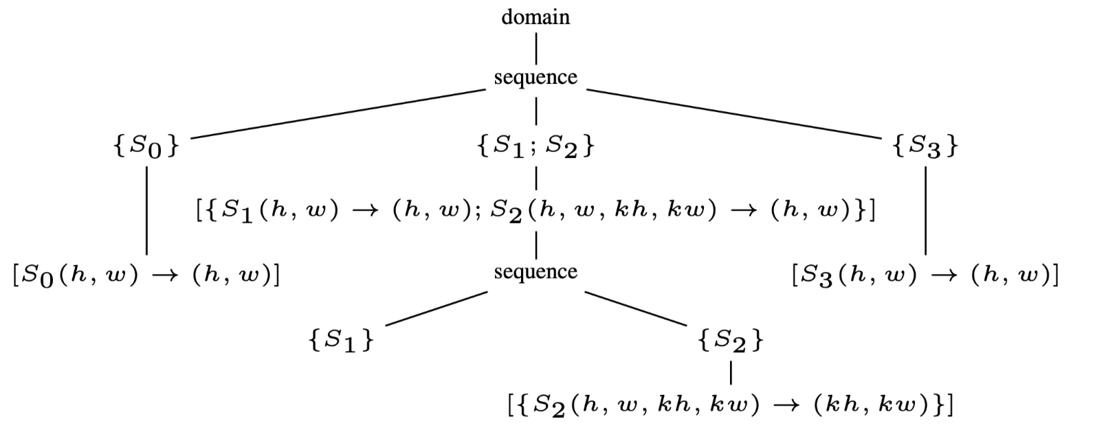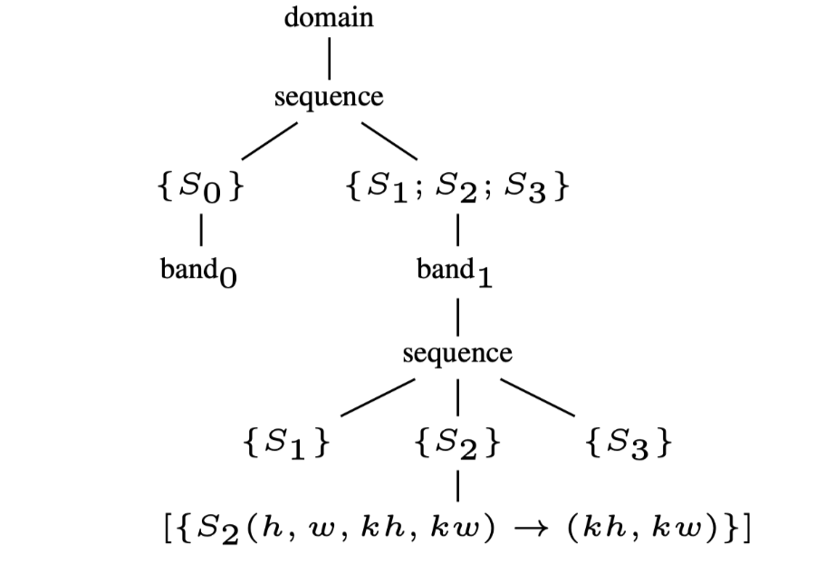 比如将图1(a)转化为图2(a)的调度树的形式,其中domain节点可以被表示为Presburger set: \[ \{ S_0(h,w) : 0 \leqslant h \lt H \land 0 \leqslant w \lt W ;\\ S_1(h,w) : 0 \leqslant h \leqslant H − KH \land 0 \leqslant w \leqslant W −KW ; \\ S_2(h,w,kh,kw) : 0 \leqslant h \leqslant H − KH \land 0 \leqslant w \leqslant W − KW \land 0 \leqslant kh \lt KH \land 0 \leqslant kw \lt KW ; \\ S_3(h,w) : 0 \leqslant h \leqslant H − KH \land 0 \leqslant w \leqslant W − KW \} \] 初始后的调度树可以通过附加到band节点上的并行/tile信息来自动的transform到新的调度树.
