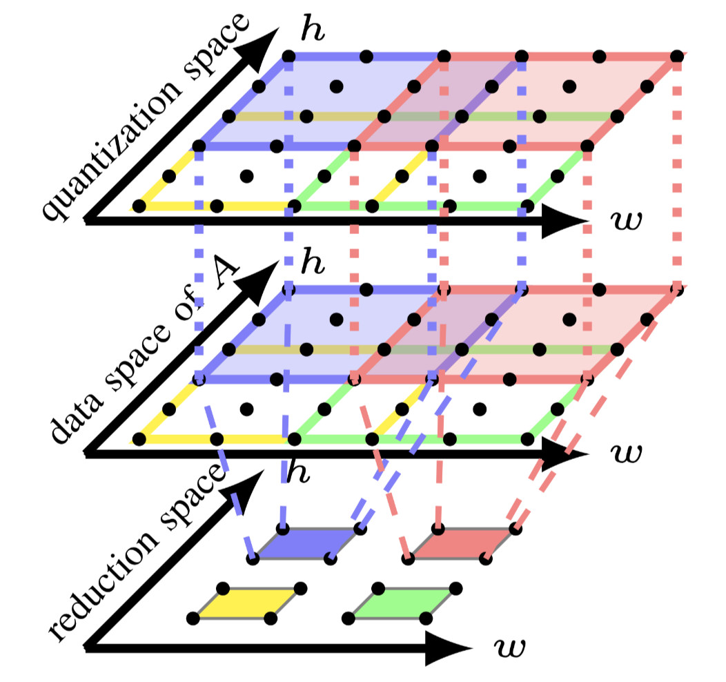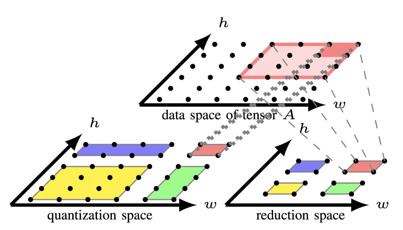 上述这种冲突是由于在现有的多面体编译器中实现的先fusion后tiling策略没有考虑data space的转换导致的.如果仅将tiling应用到reduction space,则可以获得reduction space中每个tile的对于tensor A 的内存足迹,然后可以将其用于根据 \(S_0\)和tensor A 的access relation来确定quantization space的tile形状,这样从不同计算空间中具有相同颜色的tile可以融合,因为不存在内存足迹的不匹配.通过考虑data space上的transfrom来构建quantization space的tile形状,还可以降低tile尺寸空间的大小,因为用户只需要为reduction space指定tile size.
