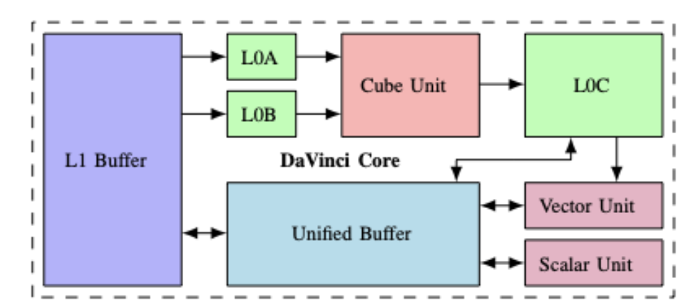 本文方法其中一个编译Target是专门的加速器Ascend 910芯片,图7描述了Davinci架构66.Cube单元是使用L0A和L0B中的数据输入来执行张量/矩阵操作的专业执行单元,其中输出存储在L0C中.L0A/L0B可以从L1 cache获取数据.L0C中的数据也可以传输到向量单元.向量/标量单元设计用于执行向量/标量操作,他们可以对unified buffer进行双向的读取/写数据,同时可以与L0C交换数据.L1 cache和unified buffer作为片上下层缓存,用于将数据与外部内存交换,这在图中未显示.其中L1 cache和unified buffer之间也可以进行数据交换.我理解整个架构的运作机制可能如下,从l1 buffer中流水的加载数据到L0A/L0B,然后Cube单元进行内积操作,输出到L0C上,此时能从Unified buffer中取激活参数等数据送到Vector单元计算,最后写回L1 buffer.