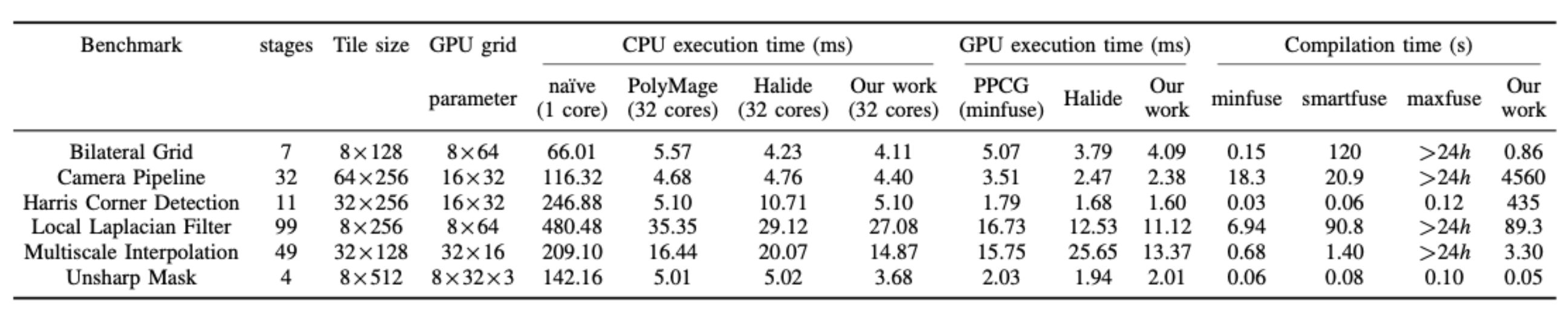 Image Processing Pipelines 图像处理pipeline在输入图像上执行给定的任务,并使用了大量复杂的的stencil和reduction操作.本文使用从PolyMage基准中提取的六个图像处理管道,在结构和复杂性方面差异很大.表1列出了PolyMage基准76.将性能与特定领域的编译器,Polymage 77和Halide的78手动调度进行了比较.Polymage编译器通过将DSL作为输入来生成naive和优化后的OpenMP代码,原始版本的代码用作基线,也输入到本文方法改进过的 PPCG ,因为naive版本由 PolyMage 生成,没有包含tiling或fusion.此外,optimized版本则包含充分的fusion和tiling.