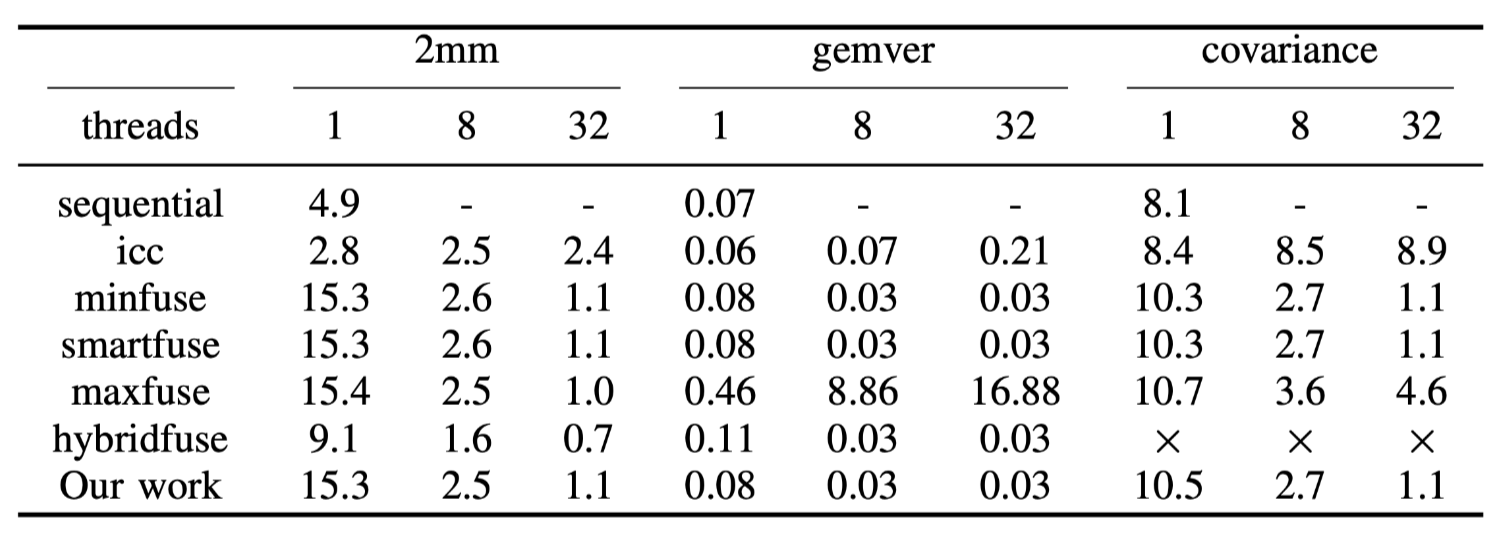 其中\(2mm\)是执行两个矩阵乘(\(D=A\times B; E=C \times D\))当使用不同的PPCG中的方法或本文的方法时,并没有观察到其执行时间存在显着差异,因为每个启发式fusion都可以保留并行性/可切分性.HybridFuse可以达到最佳性能,因为最大程度在最内层fusion可以受益于icc编译器的自动向量化. 未来和HybridFuse整合可能是后续的研究方向.