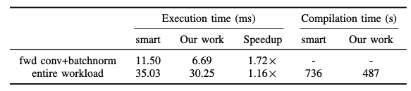 本文算法编译到Ascend 910利用了一种激进的fusion策略,不是SmartFuse,会产生更少的computation space,从而减少了Resnet-50的代码生成时间.