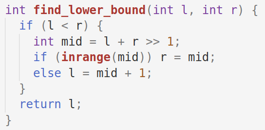 上图看出来我们需要找下界,接下来我们只需要对比最右侧的元素确定我们当前位于右区域还是左区域即可,然后模板一走起~