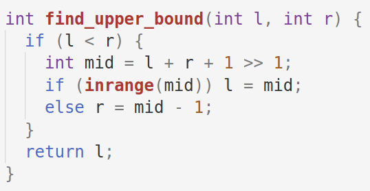 ![]() 找上界,r必然缩小,极端情况时等于mid-1 |