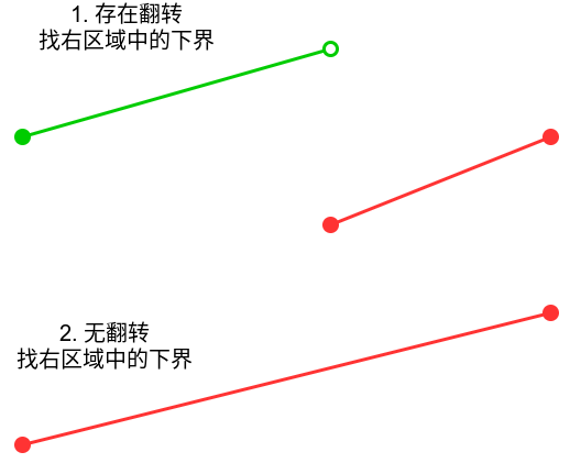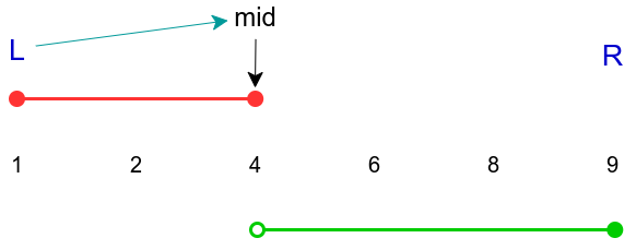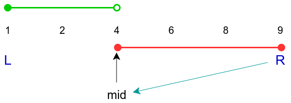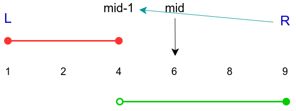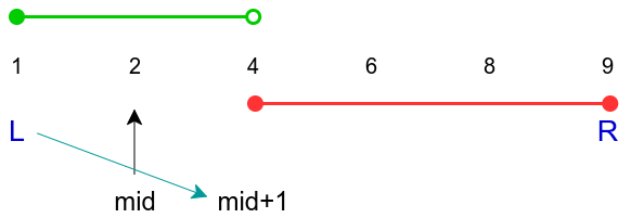 | mid不在区间中 | ![]() 找下界,l必然增大,极端情况时等于mid+1 |