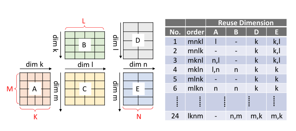 reuse_dims = perms[last_access_dim(buffer, perms) + 1:]比如上图中mnkl的顺序,其中m,k参与访问A, 因此只有l是reuse dim.