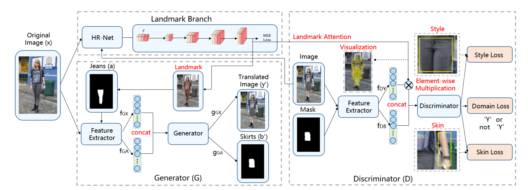DESIGN-GAN: CROSS-CATEGORY FASHION TRANSLATION DRIVENBY LANDMARK ATTENTION这是来自Alibaba的一篇论文,不过他投的会议,一共只有5页,感觉有的部分没有说清楚。这篇论文提出一种基于landmark 引导的注意力cyclegan,用于人物换装。