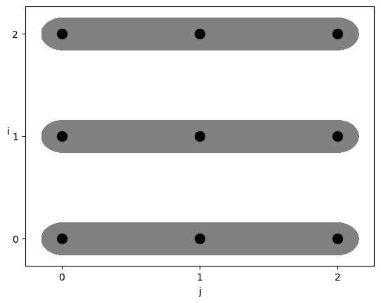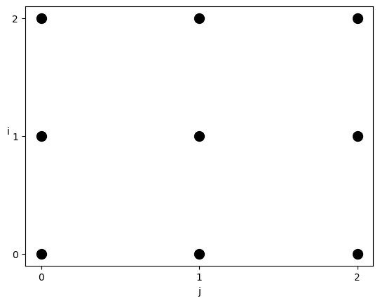 domain = isl.set("{ S[i, j] : 0 <= i < 3 and 0 <= j < 3}")如图所示: