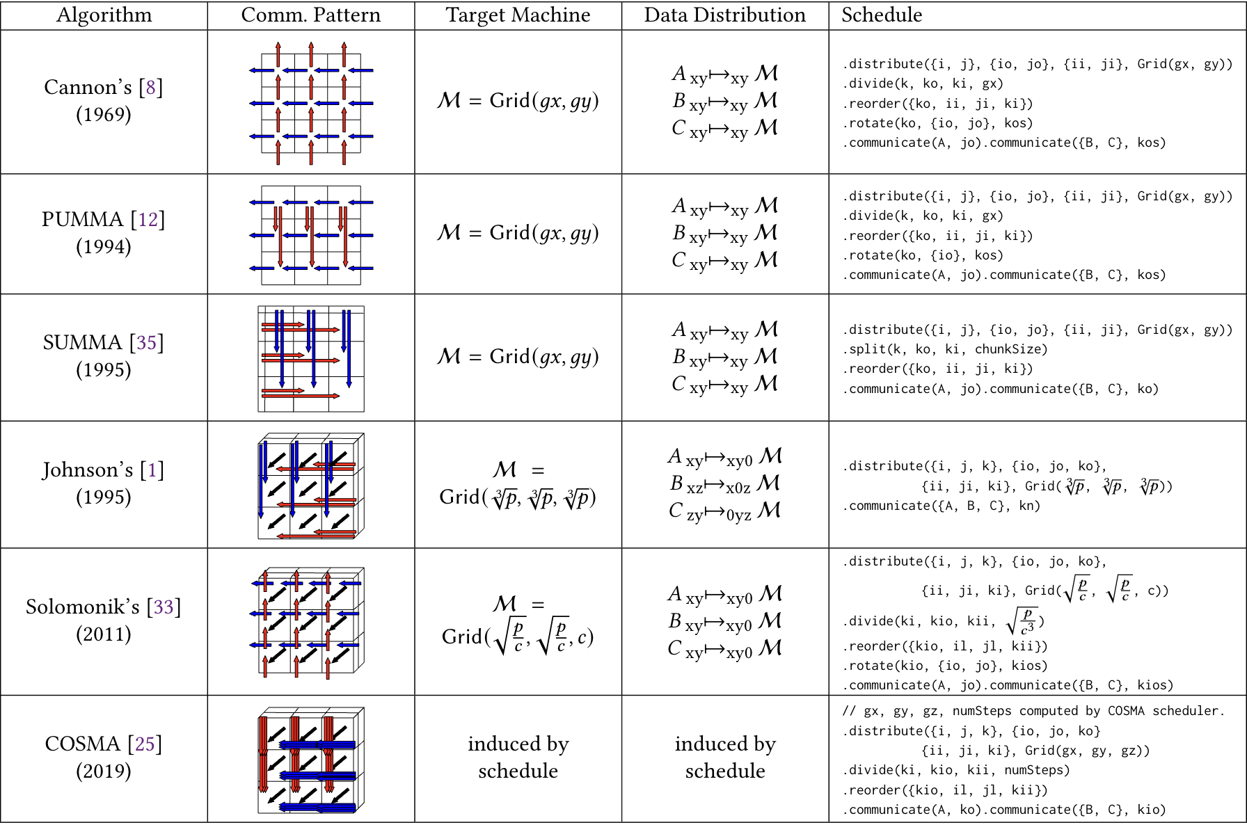 distal中采用Tensor Distribution Notation和Computation Schedule可以组合起来表达各种各样的分布式算法。当然大量分布式算法都集中在分布式矩阵乘法算法上。因此distal展示了实现各种分布式矩阵乘算法的例子: