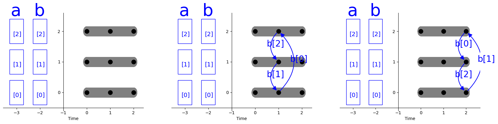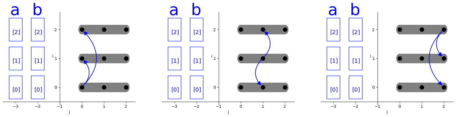当数据分布在不同的处理器上时,在发生计算时就需要将所依赖的数据从别的处理器节点上获取,因此需要进行数据的通信。基于distribution notation以及多面体分析,我们可以计算得到每一次迭代所需要传输的数据。将这种数据依赖以及循环j的前三次迭代绘制出来,如下所示: