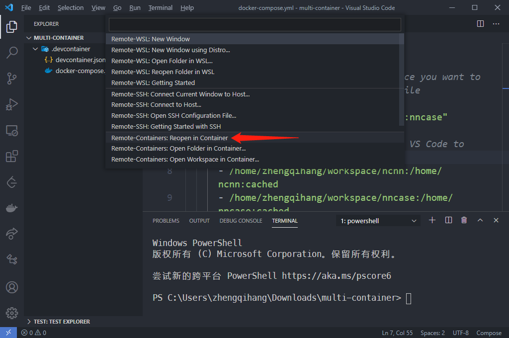 在multi-container中点击左下角的蓝色链接标志,然后选择reopen in container,最后当前文件夹被远程容器的repo替换掉。