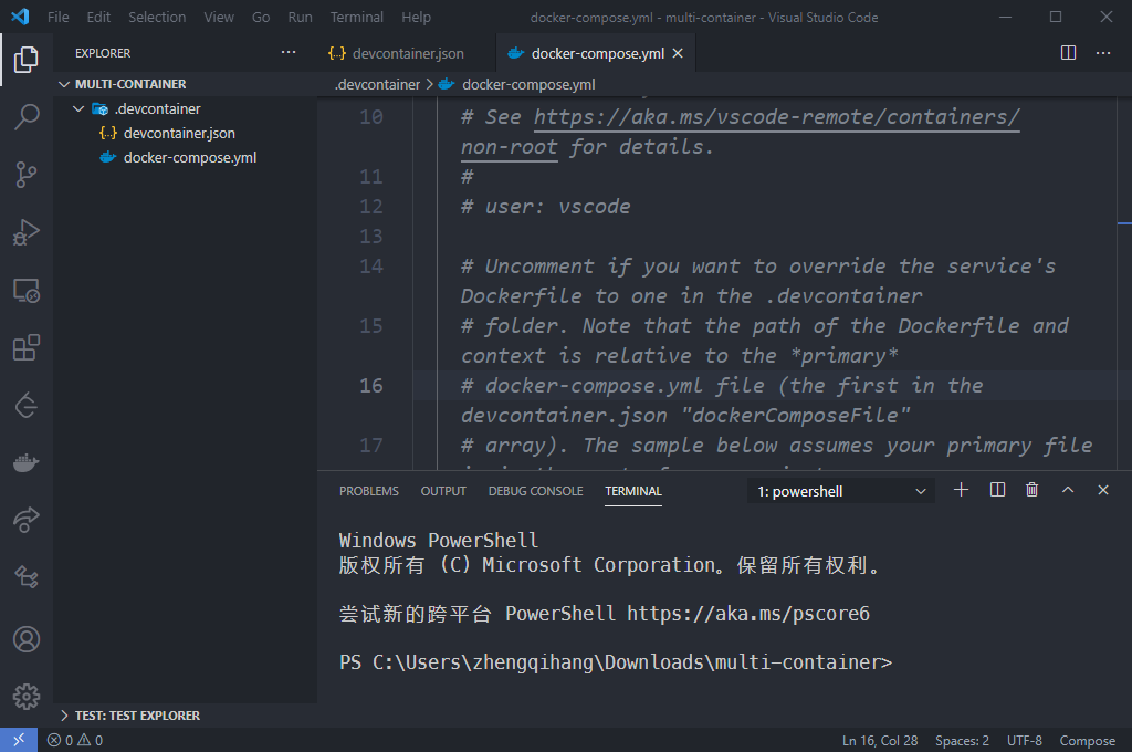 我是在Windows中建立一个multi-container的文件夹,用vscode打开然后建立docker配置文件: 在其中建立.devcontainer文件夹,.devcontainer\devcontainer.json与docker-compose.yml。