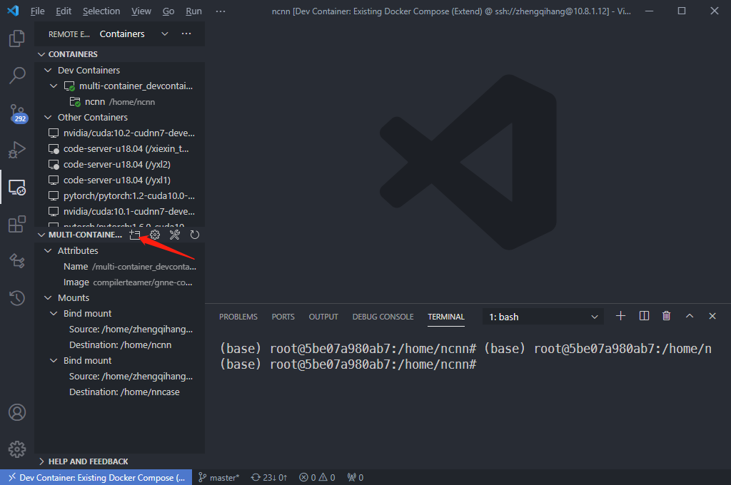 我们默认打开的是ncnn的文件夹,如果要打开nncase的文件夹需要在remote-container插件中进行attch,然后就默认打开了下一个挂在的卷,也就是ncnn。