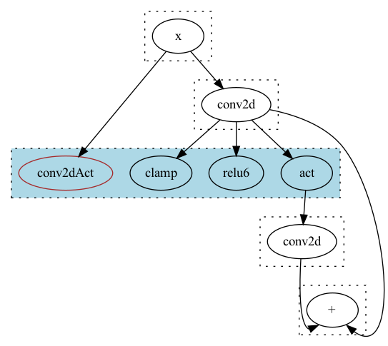 假设我们导入的模型有卷积/激活等算子,在Cpu上我们支持的Relu6/Clamp算子,他们的Cost分别为60,70. 后端支持卷积Conv,通用激活Act,以及卷积+通用激活ConvAct, 设他们的Cost分别为100,50,125. 其中执行ConvAct肯定是快于分别执行Conv和Act.