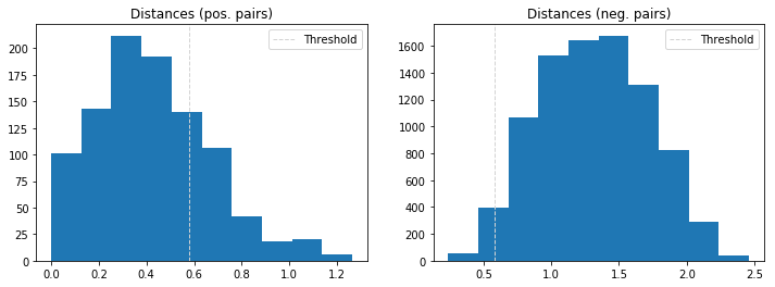 以下两个直方图显示了正负对的距离分布和决策边界的位置。这些分布明显分开,这解释了网络的辨别性能。人们也可以发现正对中的一些强异常值,但这里不再进一步分析。