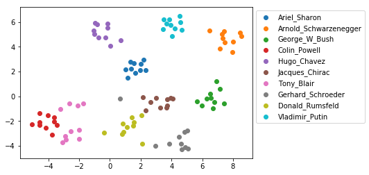 为了将数据集嵌入到2D空间中以显示身份聚类,将t-distributed Stochastic Neighbor Embedding(t-SNE)应用于128维嵌入向量。除了一些异常值,身份集群很好地分开。