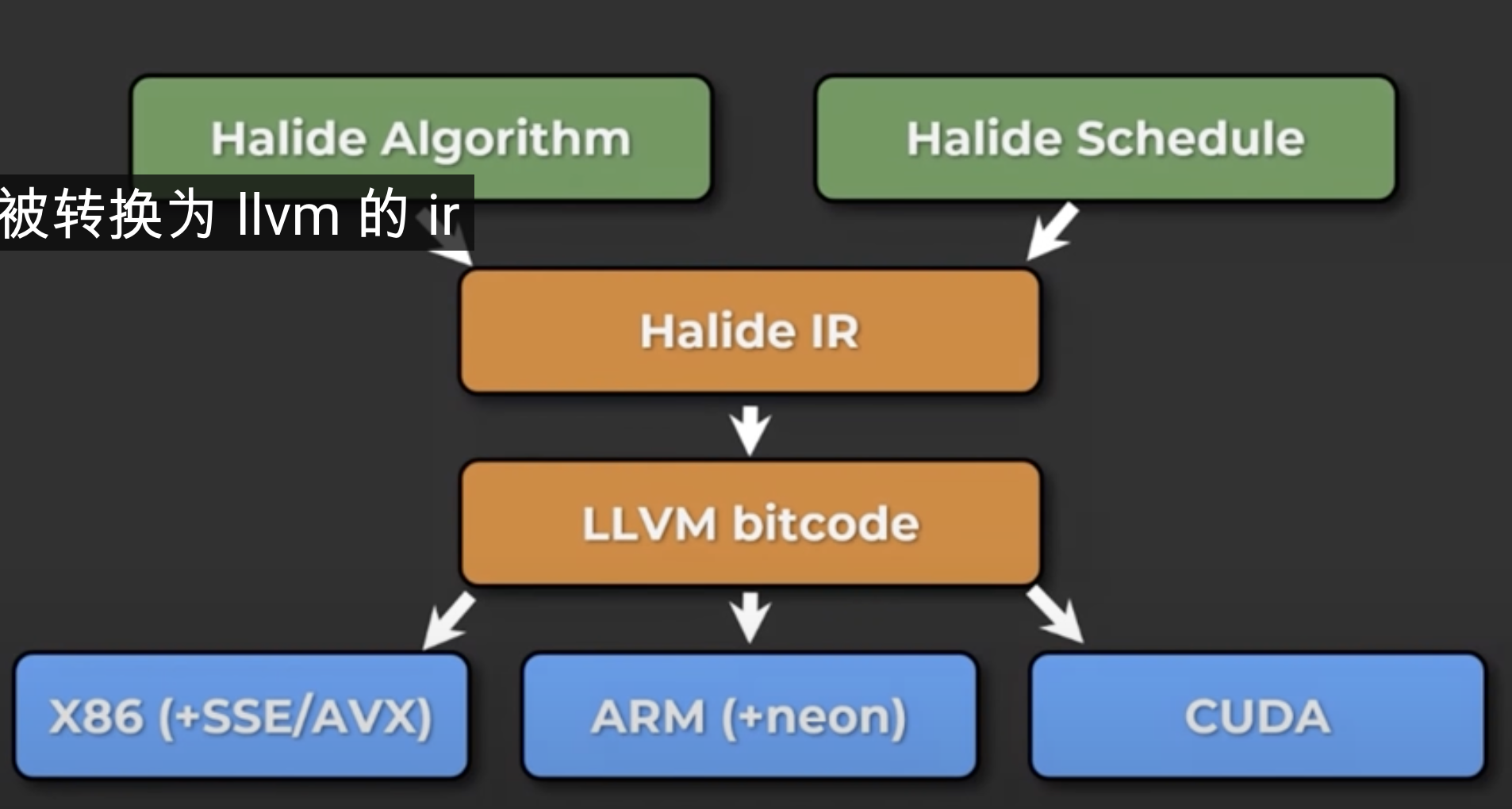 halide是一个抽象语言,他通过运算过程描述以及运算优化描述生成halide的IR,然后使用llvm库生成多个平台的代码。