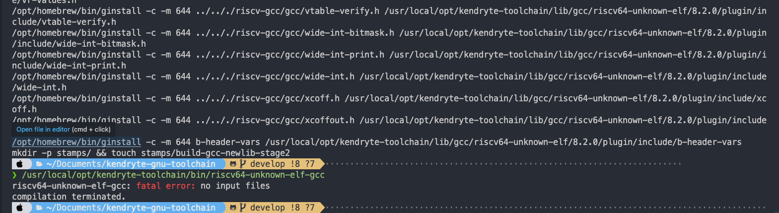 clang: error: linker command failed with exit code 1 (use -v to see invocation)参考这个方案,在riscv-gcc/gcc/config/host-darwin.c中添加两行代码,以根据当前host重新生成.