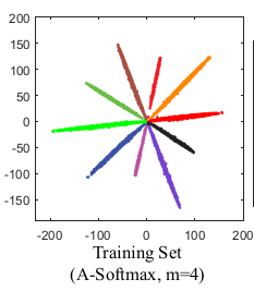 注: 写到这里我发现这tm就是一个作者的两篇文章,到这里A softmax还是与L softmax的区别就在于是否对\(\parallel\boldsymbol{W}\parallel\)进行归一化.这样的话对于分类来说可以观察到A softmax的分类结果都是长度会趋近相同,L softmax的分类长度会不相同.