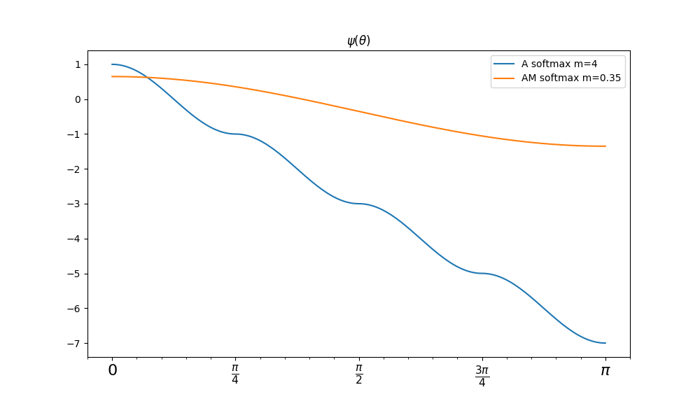 为了避免\(cos\)的问题,就设计 \[ \begin{aligned} \psi(\theta_{y_i,i})=(-1)^k\cos(m\theta_{y_i,i})-2k\ \ \ \theta_{y_i,i}\in[\frac{k\pi}{m},\frac{(k+1)\pi}{m}],且k\in[0,m-1] \end{aligned}\]