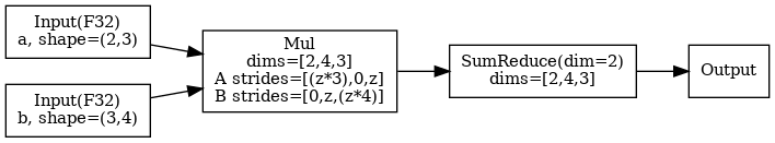 它的设计很类似 Jittor,通过扩展 layout 的方式表示循环区域。观察上面的 Mul 和 SumReduce 节点:input 节点的 rank 是 2 维,但是 Mul 使用 dims=[2, 4, 3],两个输入的 strides 分别是 [(z*3), 0, z] 和 [0, z, (z*4)](其中 z 是 sizeof(dtype))。stride 里那个 0 就是 expand_dim 制造出来的 broadcast 维度。没有单独的 Shape 操作 op,基本都由 ShapeTracker 来表达。