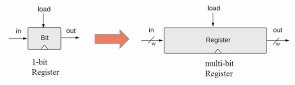首先将1bit寄存器进行泛化可以得到多位的寄存器,可以把多个bit看作一个word,此课程主要讨论16bit的cpu构建。