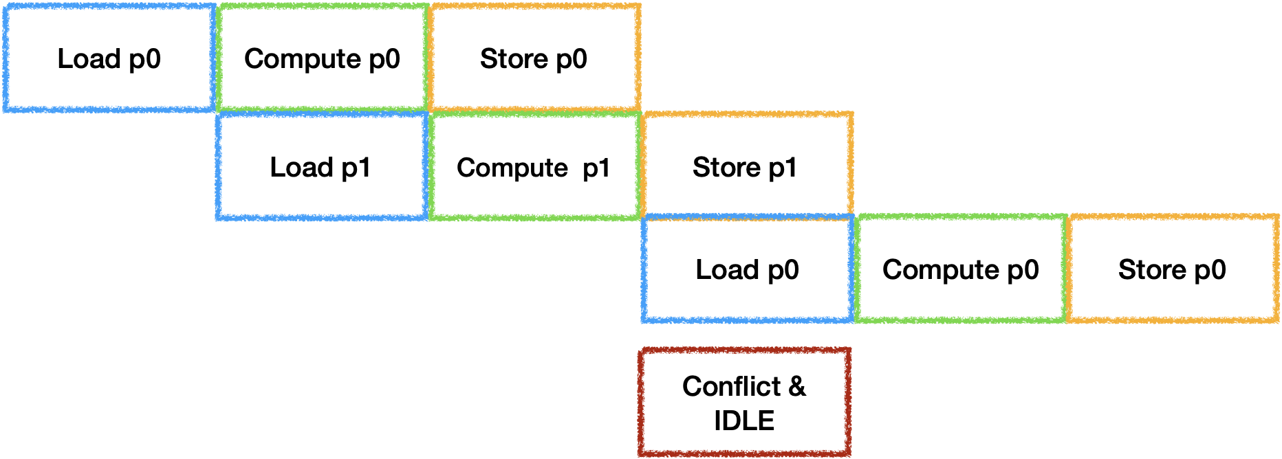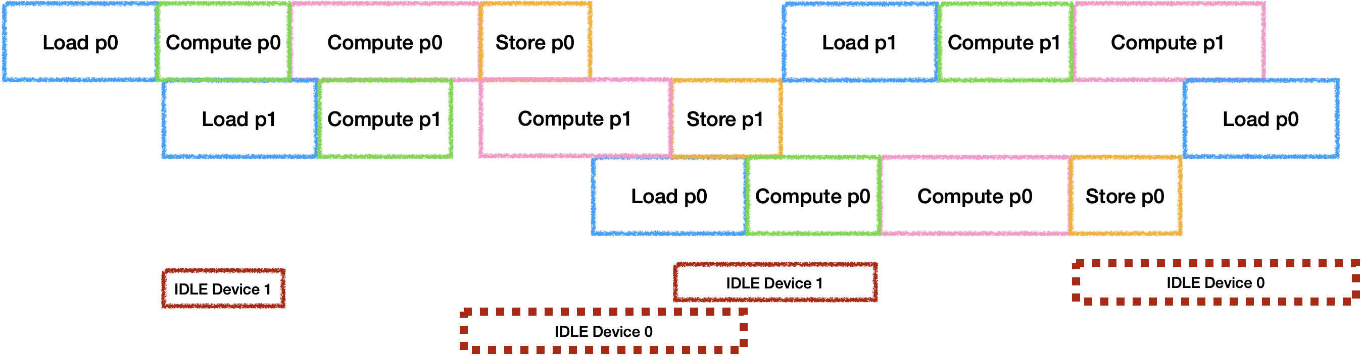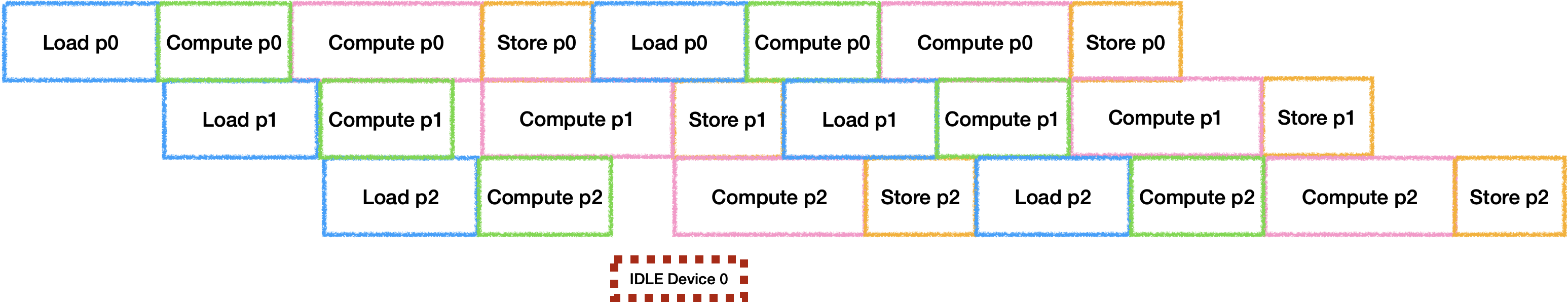 为了充分利用器件, 每个Tile之间的IDLE也需要进行消除. 通常的做法是开辟并行器件数个Buffer来进行计算, 最理想的状态是每个器件的工作时间等长: