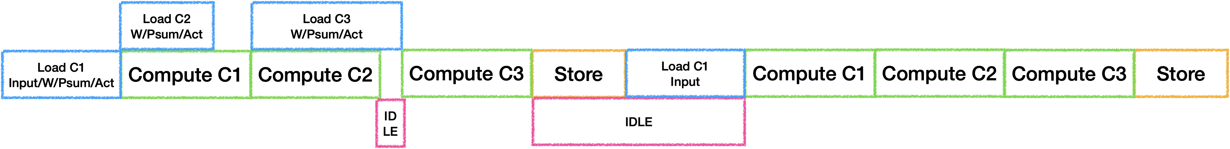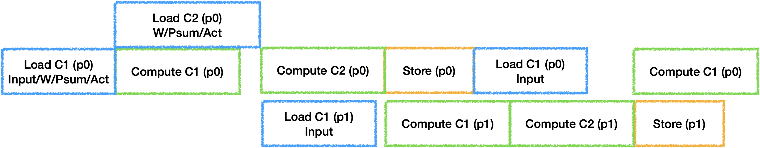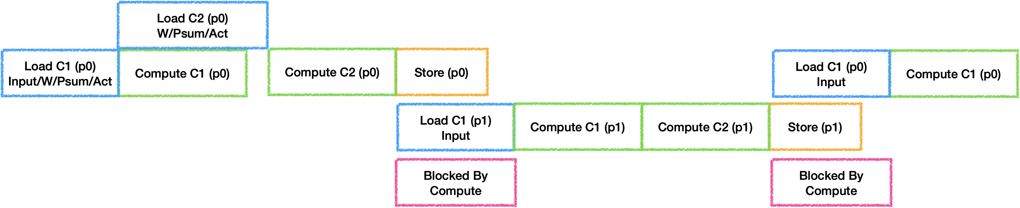 为了充分利用器件, 每个Tile之间的IDLE也需要进行消除. 通常的做法是开辟并行器件数个Buffer来进行计算, 最理想的状态是每个器件的工作时间等长: