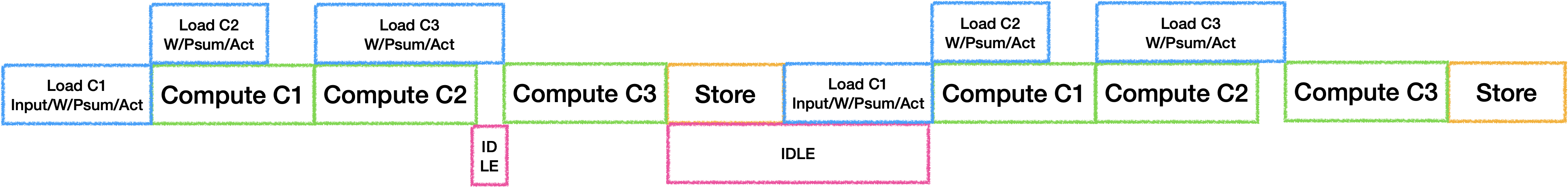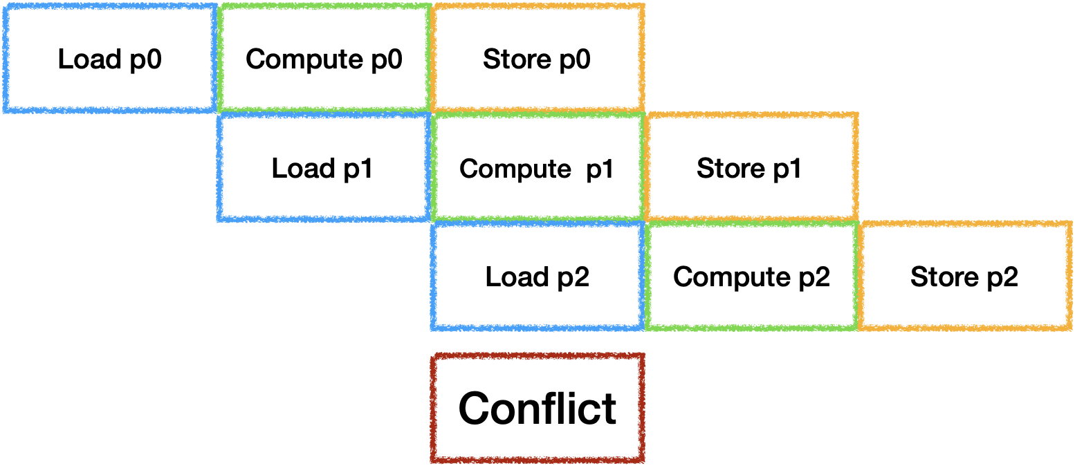 虽然Load/Store是可以并行工作的, 但是他们会抢占带宽资源, 此时还无法准确估计时间, 因此在带宽受限的场景下可以默认将他们视为同一个器件. 由于带宽受限的问题, 在三器件并行双Buffer的情况下很容易出现每一对Ping Pong之间出现冲突与空闲: