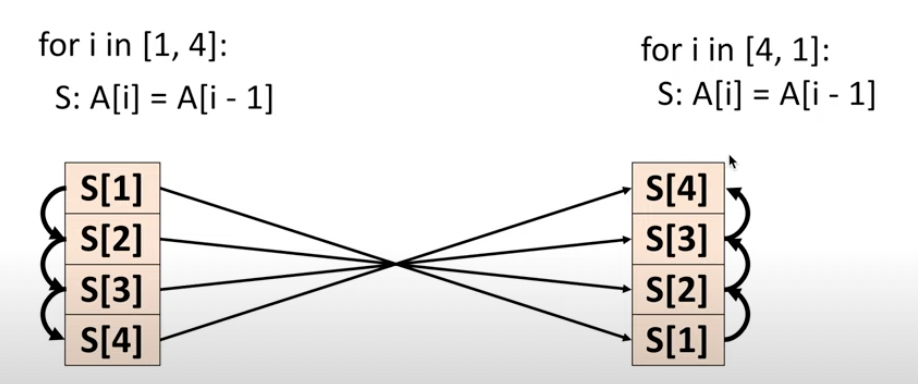 \[ \begin{aligned} &for\ i\ in\ [1,4]:\ \ &\text{range:} \ \{x[i]\ \in \ 1 \leq i \leq 4\}\\ &\ \ x[i] = x[i-1] & \text{entry}\ \ \{x[i] \rightarrow i \} \ \ \text{x[i] 在 i 时刻被执行} \\ & & \\ &for\ i\ in\ [4,1]:\ \ &\text{range:} \ \{x[i]\ \in \ 1 \leq i \leq 4\}\\ &\ \ x[i] = x[i-1] & \text{entry}\ \ \{x[i] \rightarrow 5-i \} \ \ \text{x[i] 在 5-i 时刻被执行}\\ \end{aligned} \]