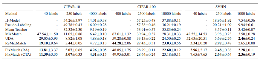 实际上经过MixMatch,ReMixMatch中大量的消融测试,作者应该已经找到了其中最重要的几个因素,所以这篇论文的理论部分比较少,因为之前的论文都已经介绍过了。实际上我认为主要加强点还是在于如何更好的使用一致性正则化,弱增强与弱增强间的所能学习到的一致性还不够,需要在弱增强与强增强间学习。同时对于人工标签的处理方式相当于选择如何进行熵最小化,也是次重要的。
