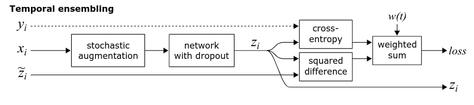Temporal ensembling时序组合模型,是针对Π model的优化,我们分析了Π model所做的两件事情,1)利用扰动样本学习一致性;2)利用有标签样本学习分类。在Π model中,\(z_i,\tilde{z}_i\)都是来自同一迭代时间内产生的两次结果,但实际上并没有必要,因为首先这样一个step就要推理两次模型,而且只在一个batch生成的概率分布偶然性较大,所以使用时序组合模型,\(\tilde{z}_i\)来自上个迭代周期产生的结果,\(z_i\)来自当前迭代时间内产生的结果,也就是比较了两次不同时间内产生的概率分布。在时序组合模型中,一个step只执行一次,那么相比于Π model,它就有了两倍的加速。同时这个\(\tilde{z}_i\)是历史\(z_i\)的加权和。这样做的好处是能够保留历史信息,消除扰动和稳定当前值。