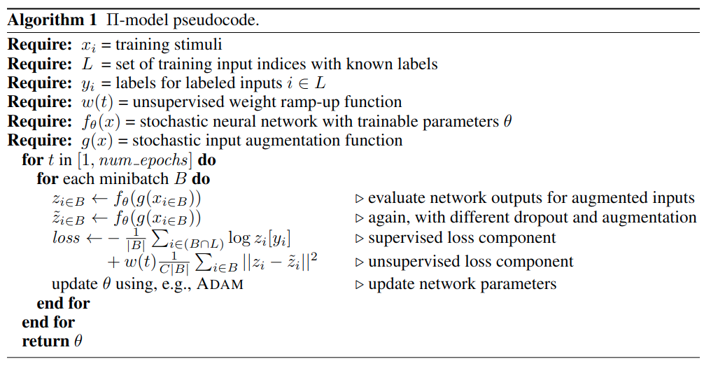 第二个算法Temporal Ensembling for Semi-Supervised Learning,它提出了一个Π model以及Temporal ensembling的方法。