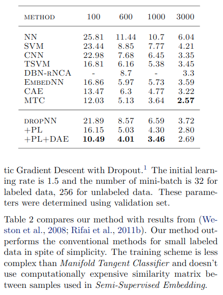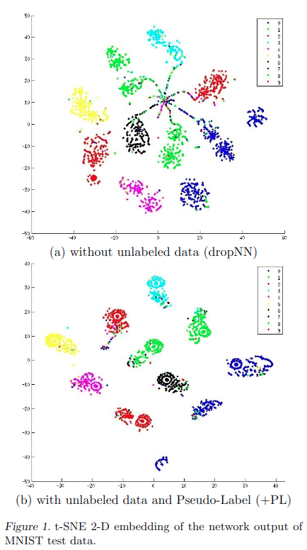 图1显示了t-SNE(Van der Maaten等人,2008年)MNISTtest数据(不包含在未标记数据中)的网络输出的2D嵌入结果。用600个标记数据训练了神经网络,60000个未标记数据和用或没用伪标签训练了神经网络。尽管在两种情况下训练误差为零,但通过训练,使用伪标签的网络输出测试数据更集中在每一项附近,换句话说,将MAP估计熵最小化。