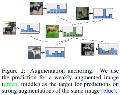 论文中说,使用了最新提出AutoAugment数据增强算法来代替原本MixMatch中的数据弱增强看看能不能提高性能,但是发现训练并不能收敛。因此提出了一个解决方法Augmentation Anchoring,它的基本想法是将模型对弱增强的未标记图像的预测结果作为同一图像的强增强的猜测标签。